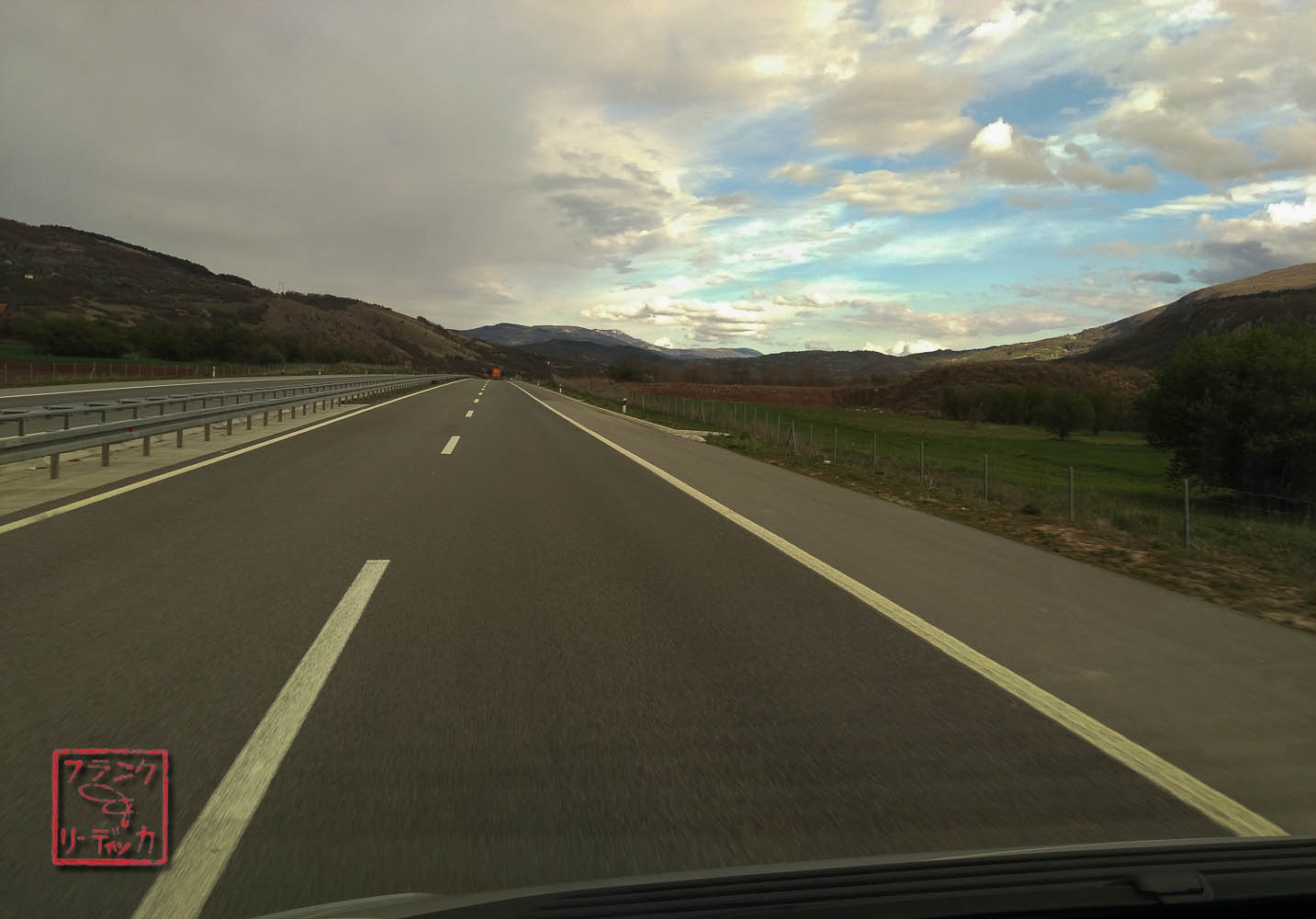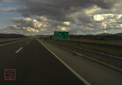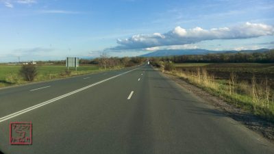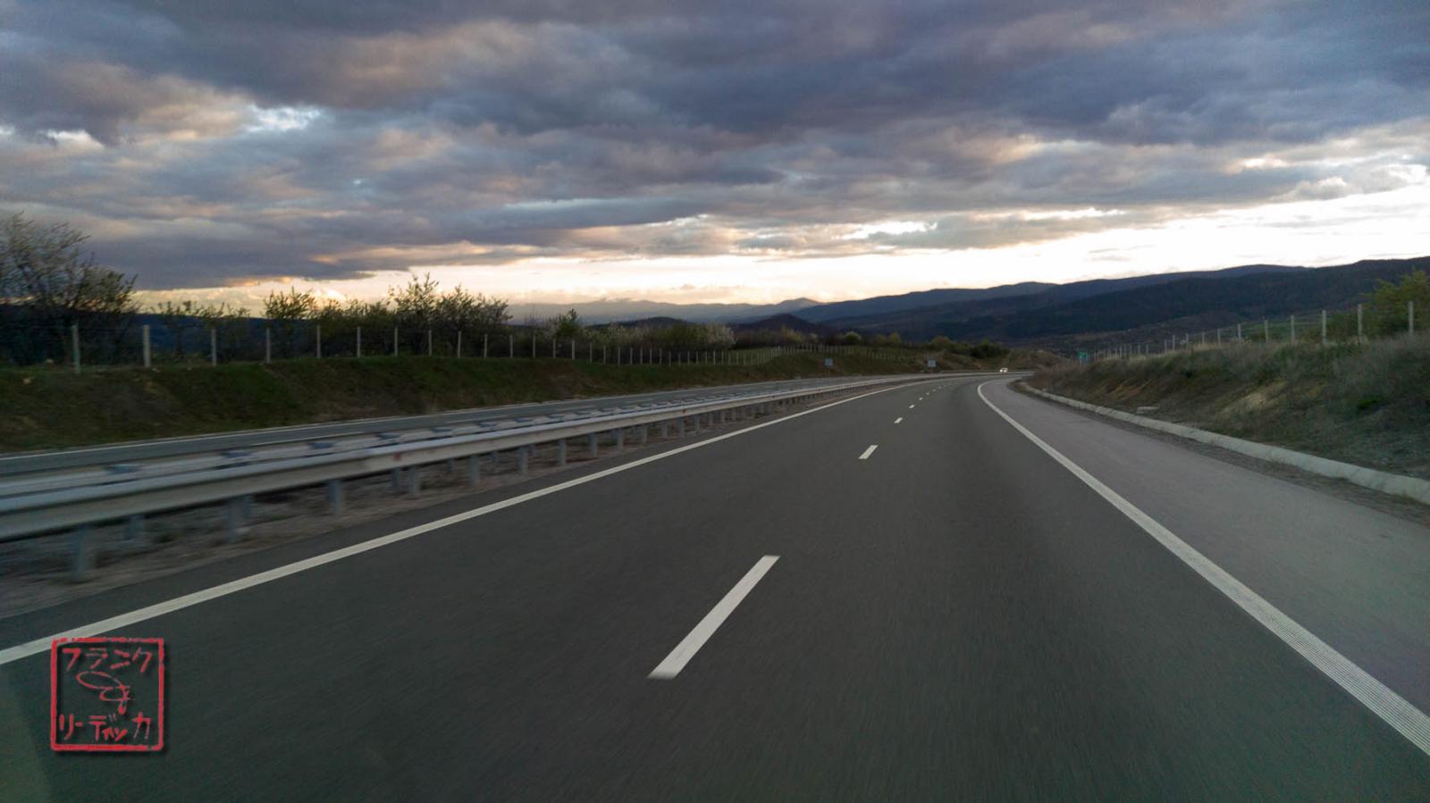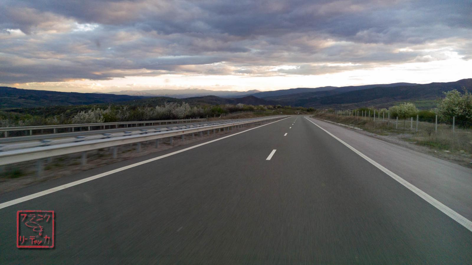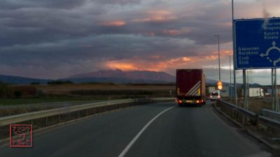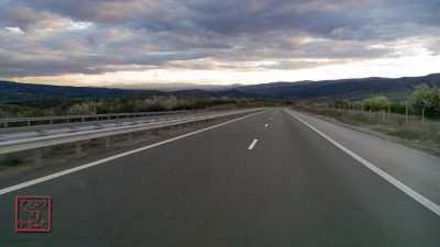 Und die Fahrt führt mich kurz vor Sonnenuntergang durch den Süden Bulgariens. Oh, upps, ich bin aufgewacht, nee, war voll konzentriert! Doch irgendetwas habe ich nicht mitbekommen! Nach ein paar Hügeln, ein paar Wolken, wenigen Mitfahrern in ihren LKW’s, eine Kurve weiter und weiter – – bin ich plötzlich ALLEIN!