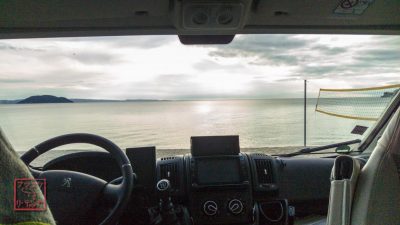 Der Strand ist mit Mietwohnwagen zugestellt. Und von oben sieht man von den Gärtnern die „ganze Arbeit“.