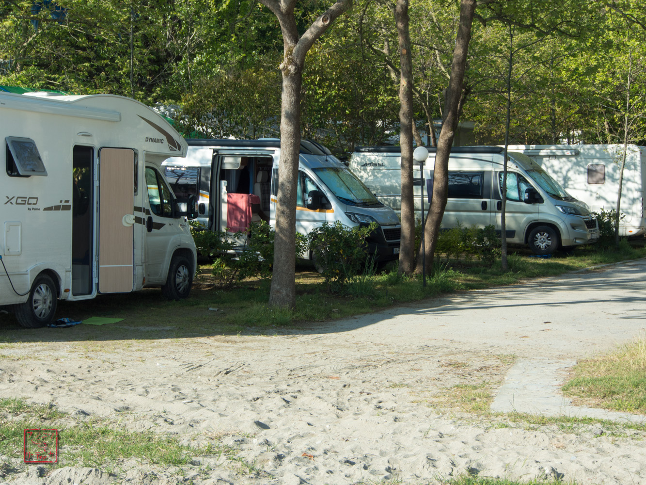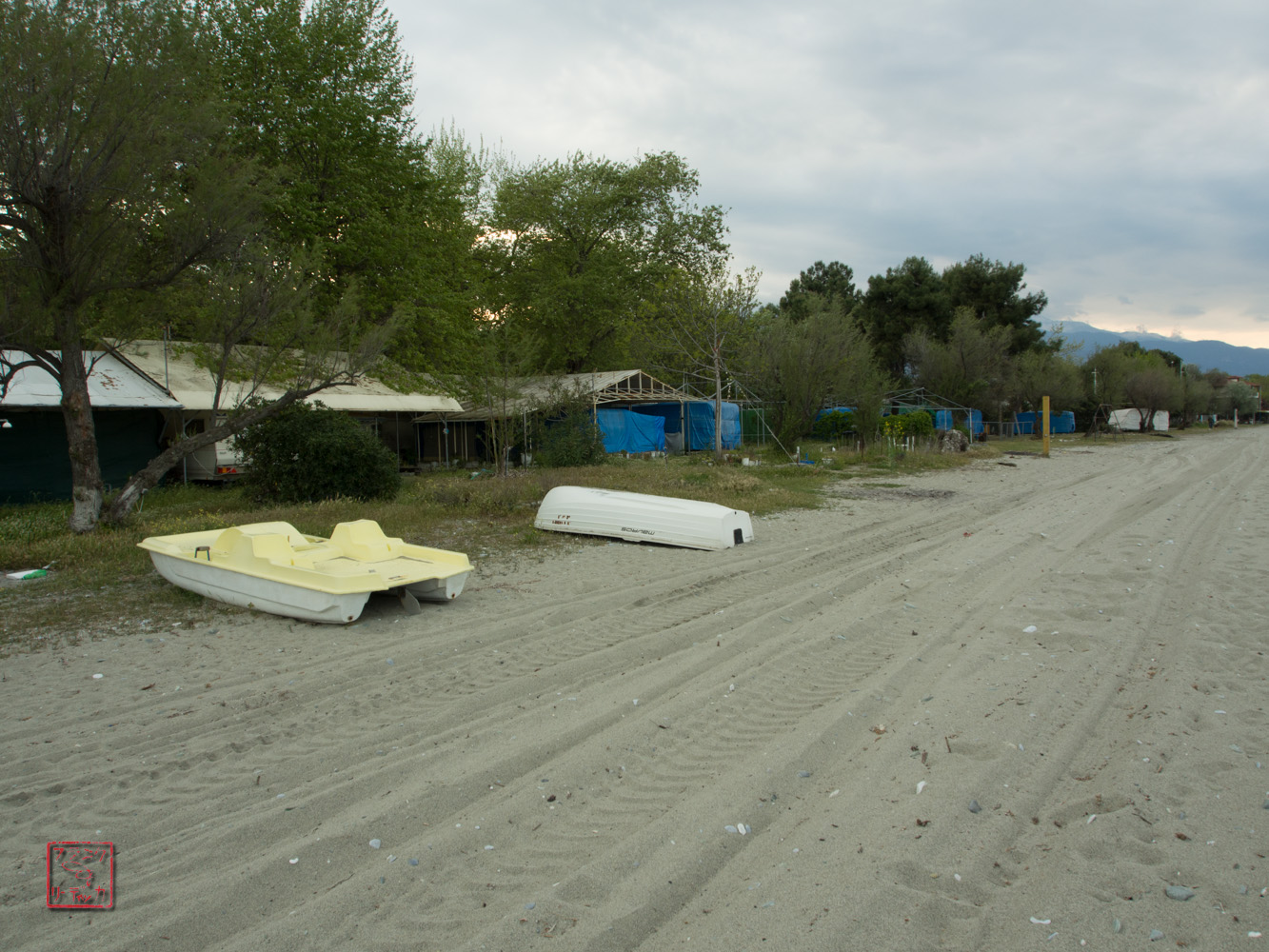Camping Poseidon (anstatt Castle Camping) hat vor dem Strand ganze 10 Plätze für Touristen. Keine Plätze haben die Camps daneben: Noch nicht geöffnet, aber komplett auf Dauerstellplätze ausgelegt. Das sieht nicht einladend aus, sondern eher wie ein geschlossener Marktplatz.