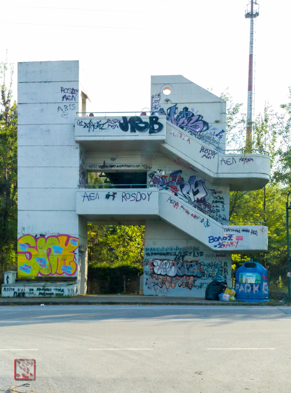 Am nächsten Tag beim Verlassen des Campingplatzes der Blick auf die Fußgängerüberführung über die Eisenbahntrasse. Was ist da schief gelaufen in den letzten Jahren, dass leere, unbeobachtete Wände als Übungsflächen für Schmutzfinger in D wie in GR angesehen werden?