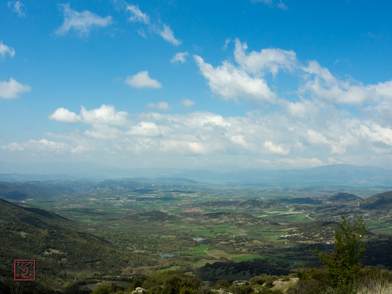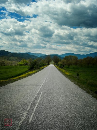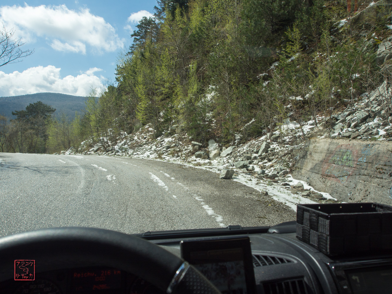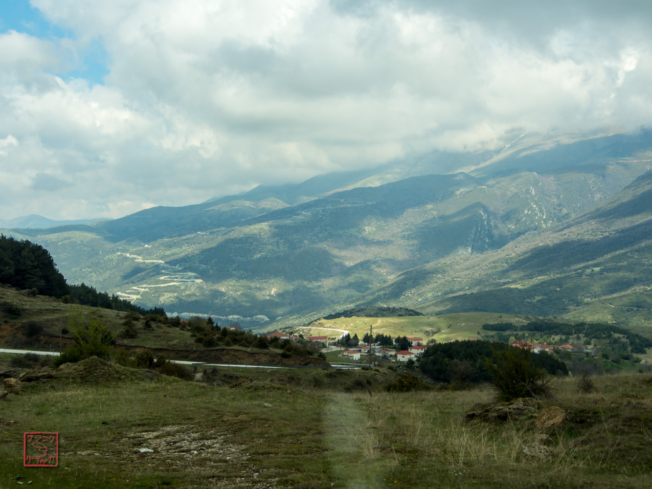 Die Gebirgsstrecke nach Meteora führt mich am Olymp vorbei: Schnee! Ja, nur ein wenig. Und dann auch andere Erinnerungen, wie z.B. die Lust der Griechen, jedes Schild von einem fahrenden Truck mit eine Gewehr zu treffen – es gibt in dieser Einsamkeit keines ohne Schußlöcher!