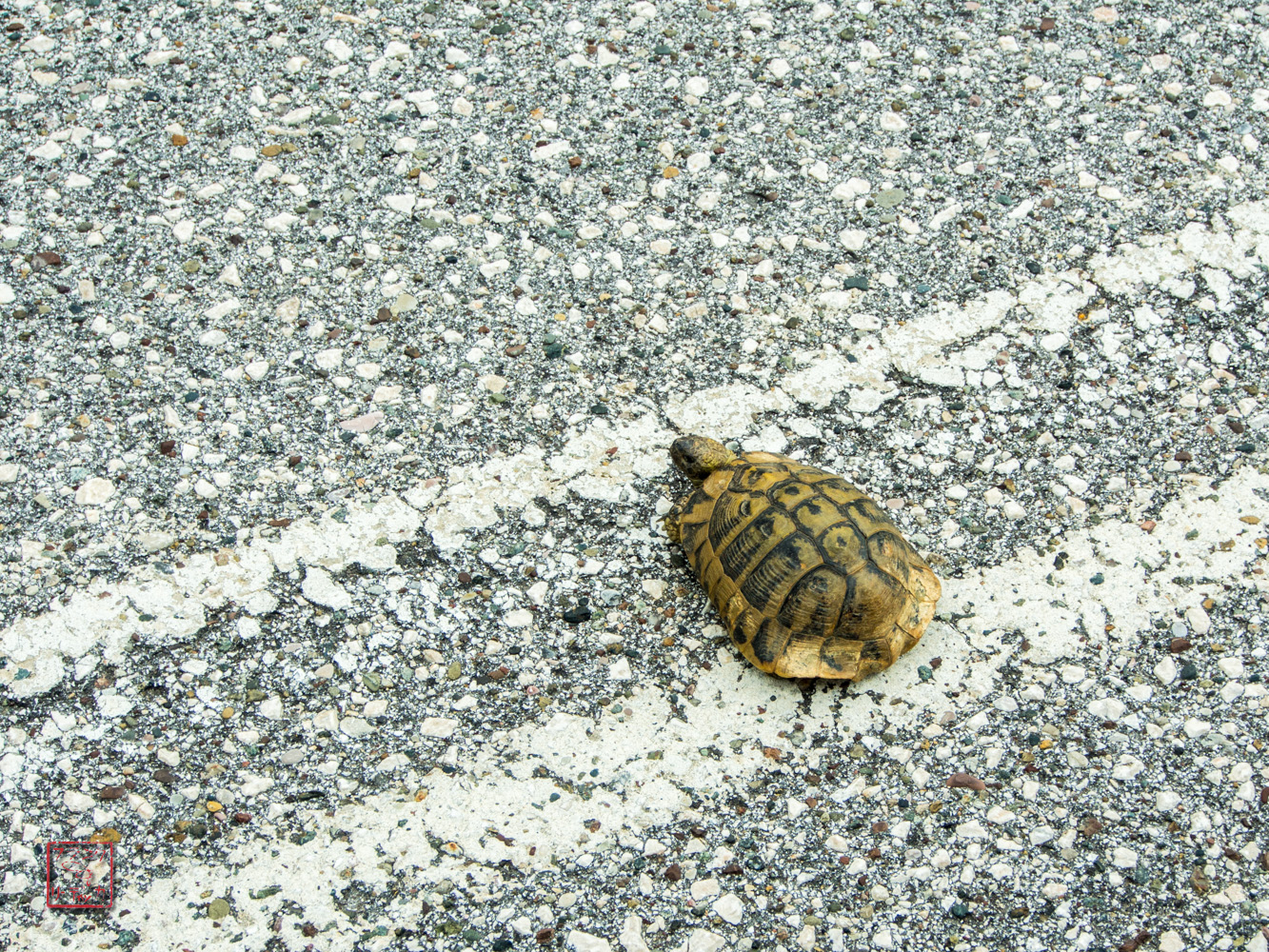 Und voraus etwas, was langsam die Straße überquert: Beim Vorbeifahren ist es dann eine Schildkröte … Wundersam hier in den Bergen!Wobei ich zum Schluß natürlich ankomme, zusammen mit 30 großen Reisebussen, 40 kleinen MB Bussen für Hotelgäste bzw. Flugreisenden aus Asien, wenig Individualreisende mit einem Leihwagen vom Flughafen, und: agile Radfahrer und Wandergruppen, die nebenbei verächtlich auf die Bemotorten blicken.
