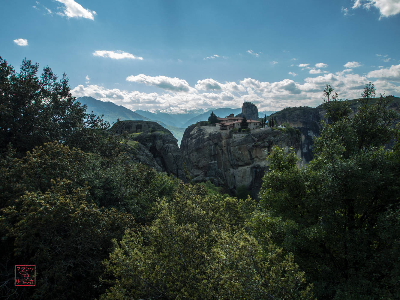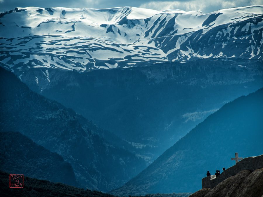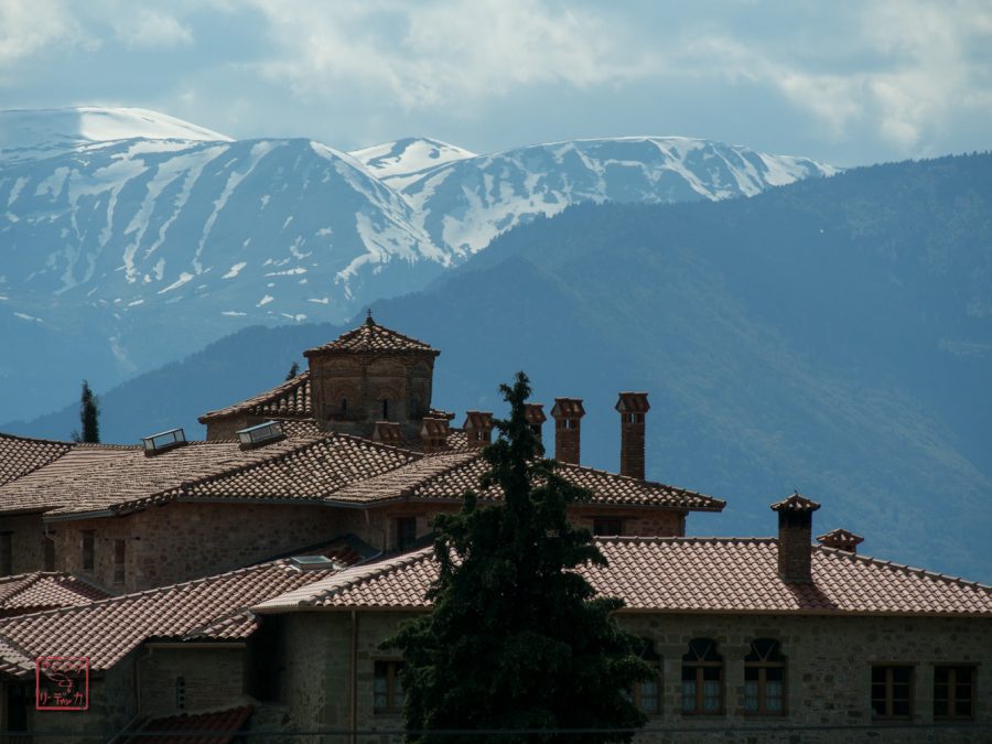 Und weil es ja ein Spaß ist, hier die schneebedeckten Berge im Hintergrund und ein Kloster mit Weitblick: