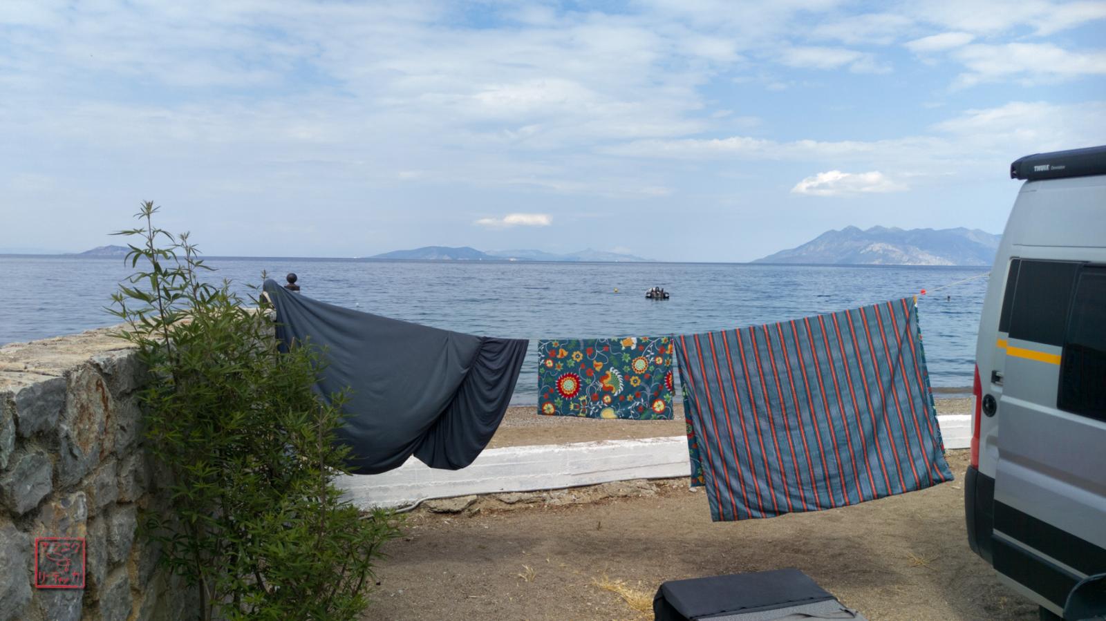 Von der gut befahrenen Sackgasse, die bei Hotels und einer überaus beliebten Strandbar endet, trennt mich nur diese Mauer. Mein erster großer Wäschetag mit einer Waschmaschine! So darf ich mich hier für 2 Tage entspannen – wenn die Tauben nicht wären: Taube Eltern, wenn die Kinder rufen, taube Hunde, wenn das Herrchen ruft, taube Rentner mit lauter Freisprechanlage und – Tauben ab morgens 5:30 Uhr.